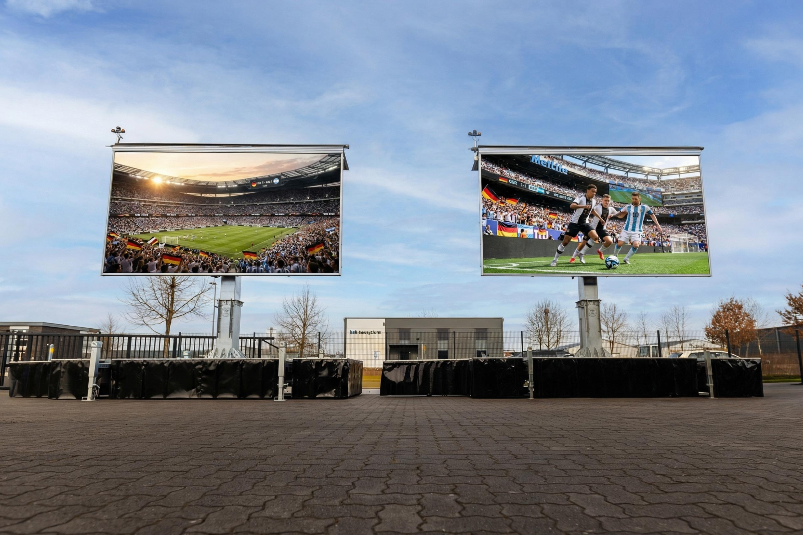 520 cm Bilddiagonale, TÜV-geprüft, in 30 Minuten betriebsbereit. Perfekt für Public Viewing, Live-Kamerabilder auf Festivals oder als Infotafel.