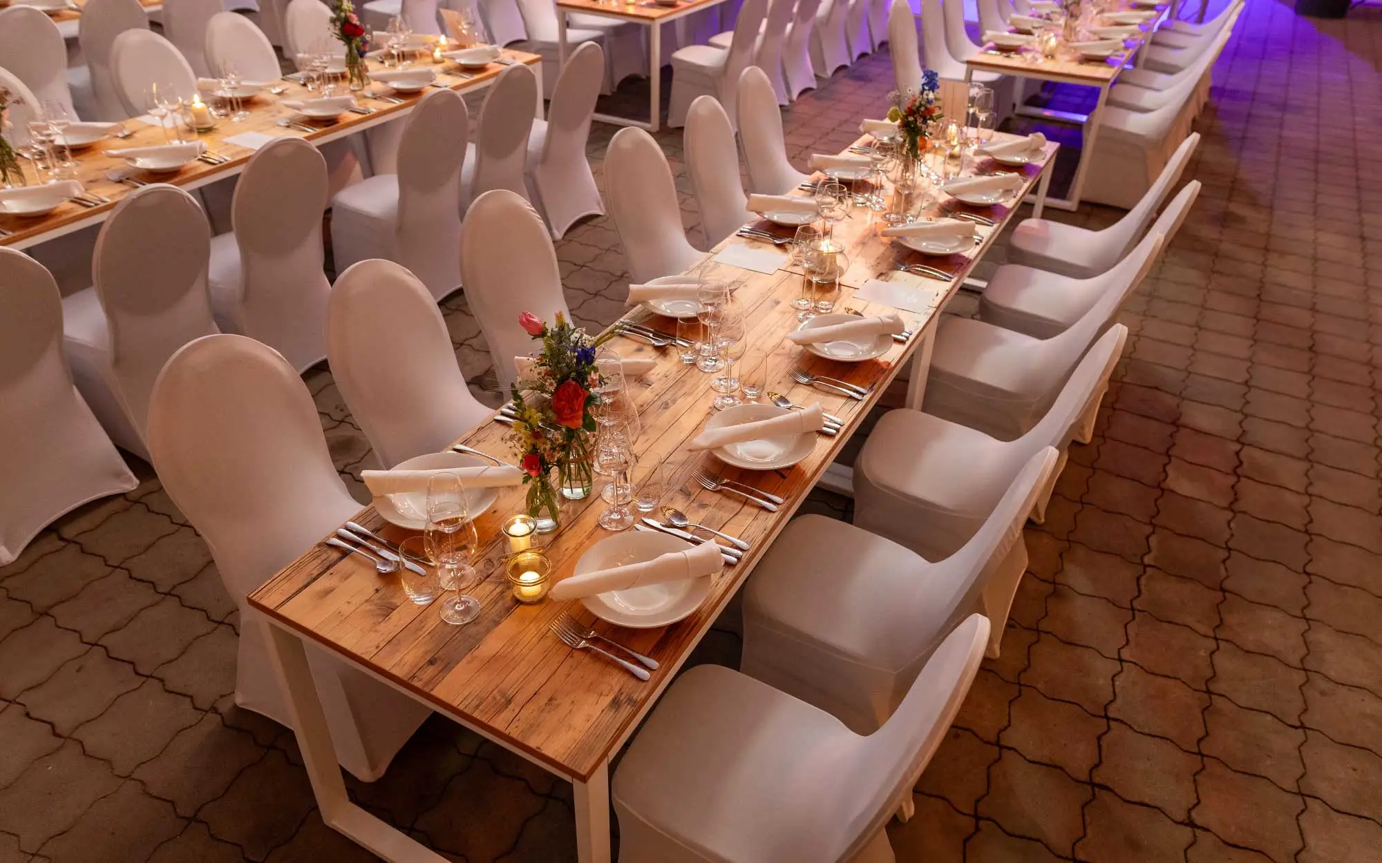Unser Team baut Traversen, Beleuchtung, Ton, Deko-Infrastruktur, Strom auf. Am Abend vor der Hochzeit steht eure Location. Ihr kommt rein, seht den verwandelten Raum und könnt den Moment genießen.