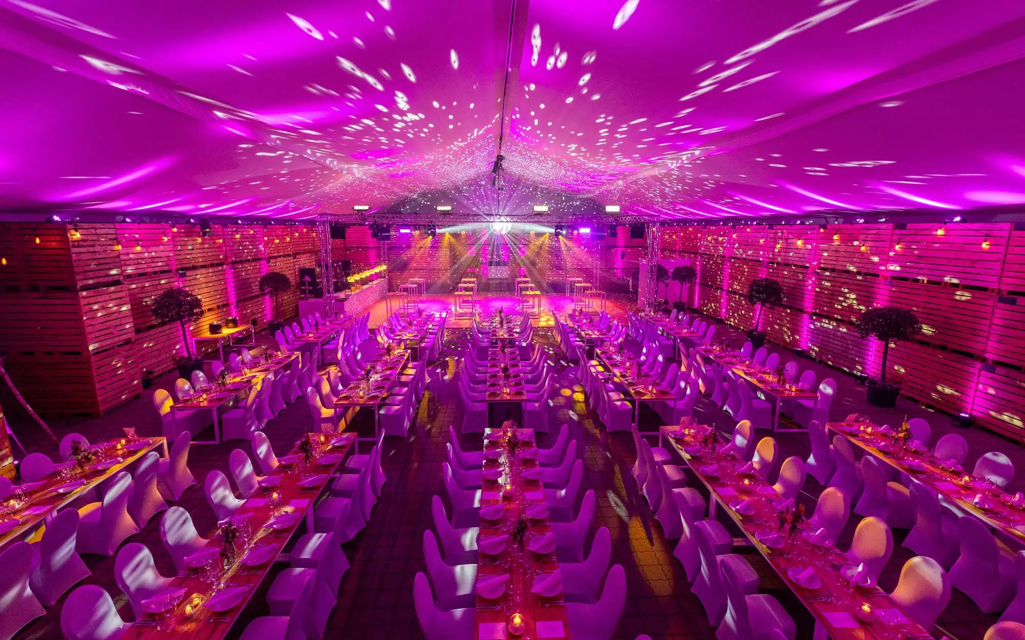 Licht ist der wichtigste Faktor bei einer Location-Verwandlung. Es entscheidet darüber, ob eine kahle Halle kalt und industriell wirkt, oder warm und magisch. Wir arbeiten mit modernster LED-Technik, um euren Ort in Szene zu setzen.: